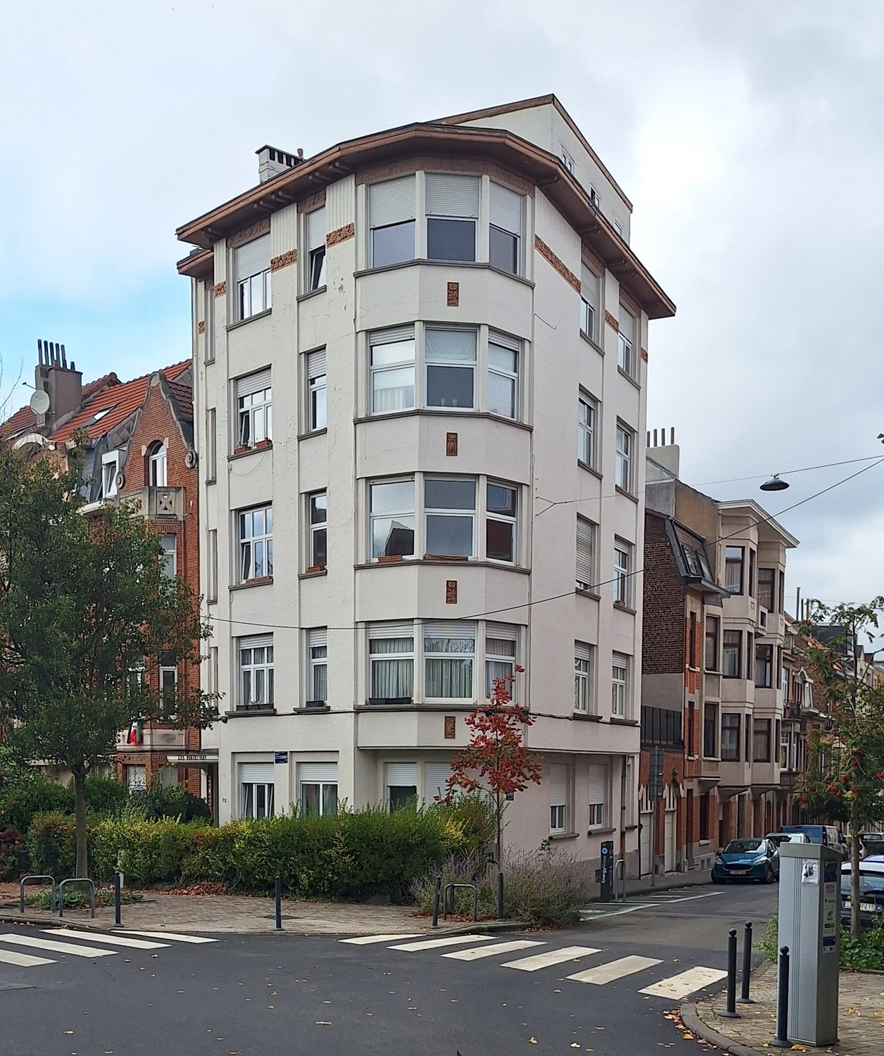 Immeuble à appartements de style Art DécoStyle Art Déco (entre-deux-guerres). Tendance à la géométrisation des formes et des ornements architecturaux, doublée de jeux de matériaux, de textures et de couleurs., construit à l’angle de l’avenue Général Eisenhower et de la rue Josse Impens, d’après les plans de l’architecte Lucien Coppé de 1934.