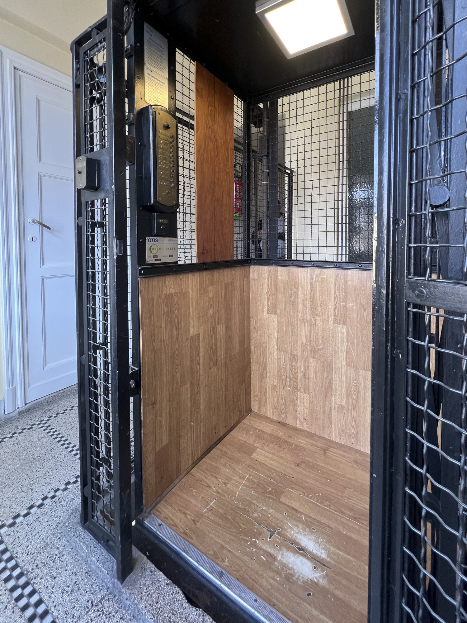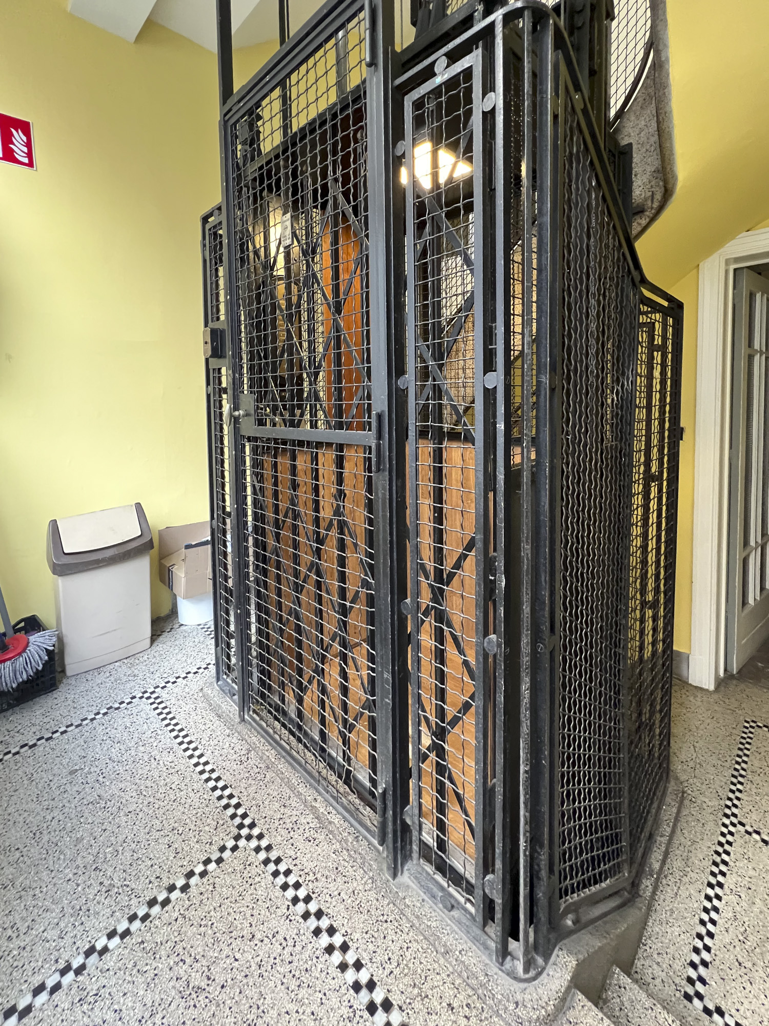 Encore en grande partie authentique, cet ascenseur de serviceAscenseur secondaire dédié à l’usage du personnel de maison et au transport de fournitures. Jaspar possède un intérêt historiqueLe bien présente un intérêt historique : - s’il témoigne d’une période particulière de l’histoire de la région ou de la commune ; - s’il représente un témoignage d’une période particulière du passé et/ou d’une évolution rare pour une période (par exemple, une cité-jardin représentative d’un mode de construction utilisé lors des grandes campagnes d’urbanisation après la Seconde Guerre mondiale, les noyaux villageois illustrant les premiers bâtiments groupés des communes de la Seconde couronne, la Porte de Hal comme vestige de la deuxième enceinte, etc.) ; - s’il témoigne d’un développement urbain (et/ou paysager) particulier de la ville (par exemple, les immeubles des boulevards centraux ou du quartier Léopold) ; - s’il présente un lien avec un personnage historique important, y compris les maisons personnelles d’architectes et les ateliers d’artistes (par exemple, la maison natale de Constantin Meunier, la maison de Magritte) ; - s’il peut être associé à un événement historique important (par exemple, les maisons datant de la reconstruction de Bruxelles suite au bombardement de 1695, la colonne du Congrès) ; - s’il possède une représentativité typologique caractéristique d’une activité commerciale ou culturelle (par exemple, les églises, les cinémas, l’architecture industrielle, les pharmacies) ; - s’il est représentatif de l’œuvre d’un architecte important dans l’histoire de l’architecture à l’échelle internationale, nationale, régionale ou locale (cela concerne à la fois des architectes connus comme V. Horta, V. Bourgeois, M. Polak mais aussi des architectes secondaires, liés localement à une commune, notamment Fernand Lefever à Koekelberg ou Emile Hoebeke à Berchem-Sainte-Agathe)., social et technique.