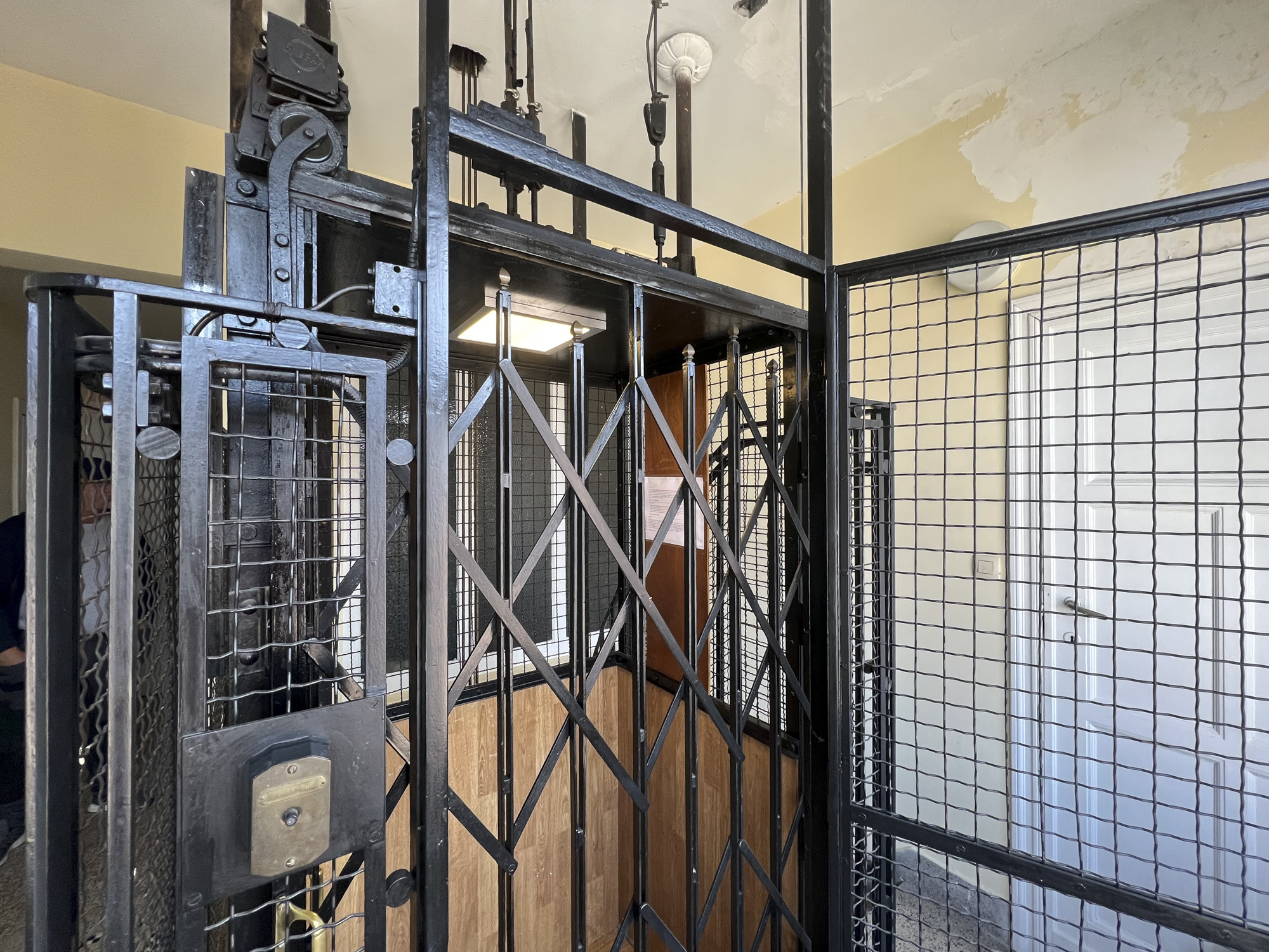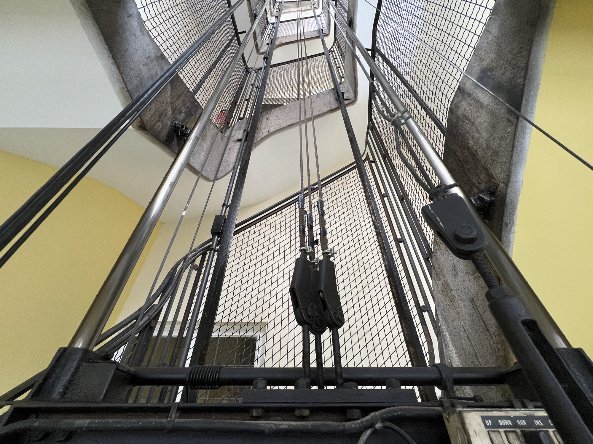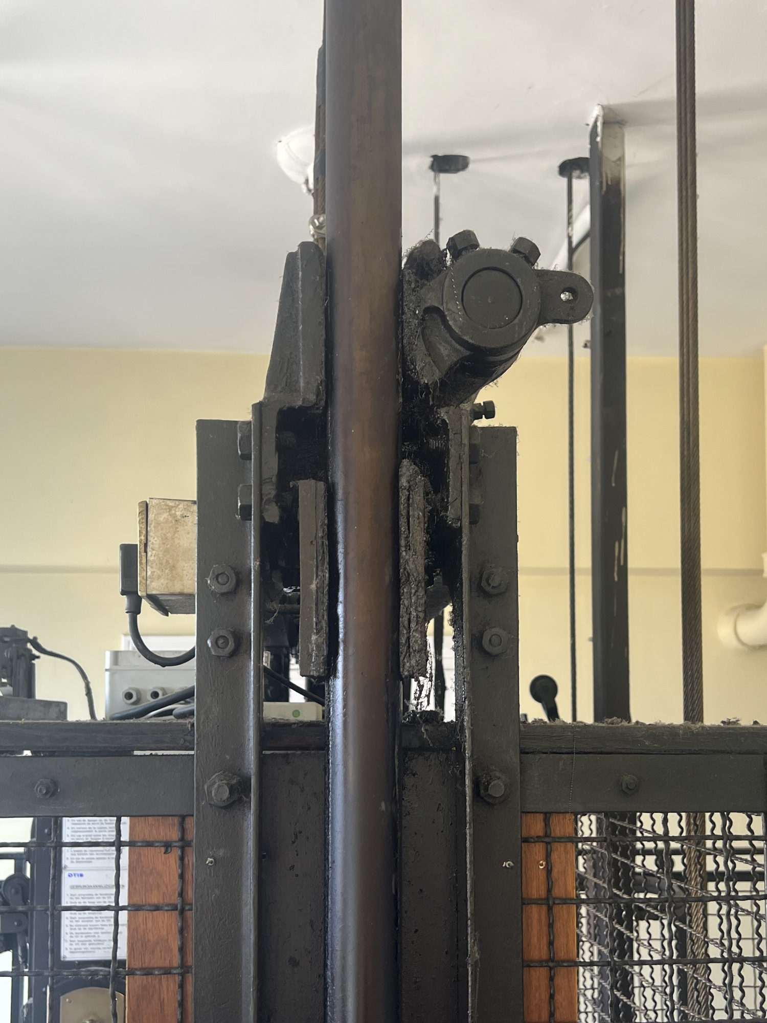 Plusieurs éléments techniques d’origine subsistent tels que les étriers de la cabine, ainsi que le système de freinDispositif placé sur l’axe du moteur qui le freine et le maintient à l’arrêt grâce à deux mâchoires se fermant sur un tambour. Par défaut, le frein est en position fermée. Son ouverture est déclenchée par l’intermédiaire d’une bobine ou d’un servomoteur. parachuteSystème de sécurité qui bloque la cabine sur ses guides en cas de rupture des câbles de traction ou de survitesse. sur l’étrier supérieur, et très probablement le contrepoidsRelié à la cabine par les câbles de traction et circulant le long de guides verticaux, il est généralement constitué d’éléments en fonte (gueuses). Son poids équivaut à celui de la cabine à demi-charge. Il contrebalance ainsi le poids de la cabine ce qui diminue l’énergie nécessaire à son déplacement.. La machinerieSitué dans un espace en partie basse ou en partie haute de l’installation, ensemble comprenant le système d’entraînement et les équipements de commande de l’ascenseur. a été remplacée partiellement, probablement en plusieurs phases. Des éléments anciens, peut-être d’origine, sont présents, comme le limiteur de vitesseDispositif pourvu d’une poulie sur laquelle passe un câble relié à la cabine. Grâce à un système basé sur la force centrifuge, il bloque le câble en cas de survitesse, ce qui déclenche le parachute. et le système de sélection d’étages. Le treuilAccouplé au moteur, dispositif mécanique qui entraîne les câbles de la cabine et du contrepoids sur un tambour ou une poulie d’adhérence. a été remplacé anciennement, il est actuellement équipé d’un moteurMoteur actionnant le treuil de l’ascenseur. italien et d’une poulieRoue dont la jante porte un ou plusieurs câbles afin de permettre la transmission d’un mouvement. Fixée sur l’axe du treuil, la poulie de traction (ou poulie d’adhérence) communique la force du moteur aux câbles de traction de la cabine et du contrepoids. La poulie de déflexion permet de déporter les câbles dans l’axe de la gaine de l’ascenseur et/ou du contrepoids. Les poulies de renvoi situées au-dessus de la gaine supportent les câbles de traction quand la machinerie est placée en bas. d’adhérence.