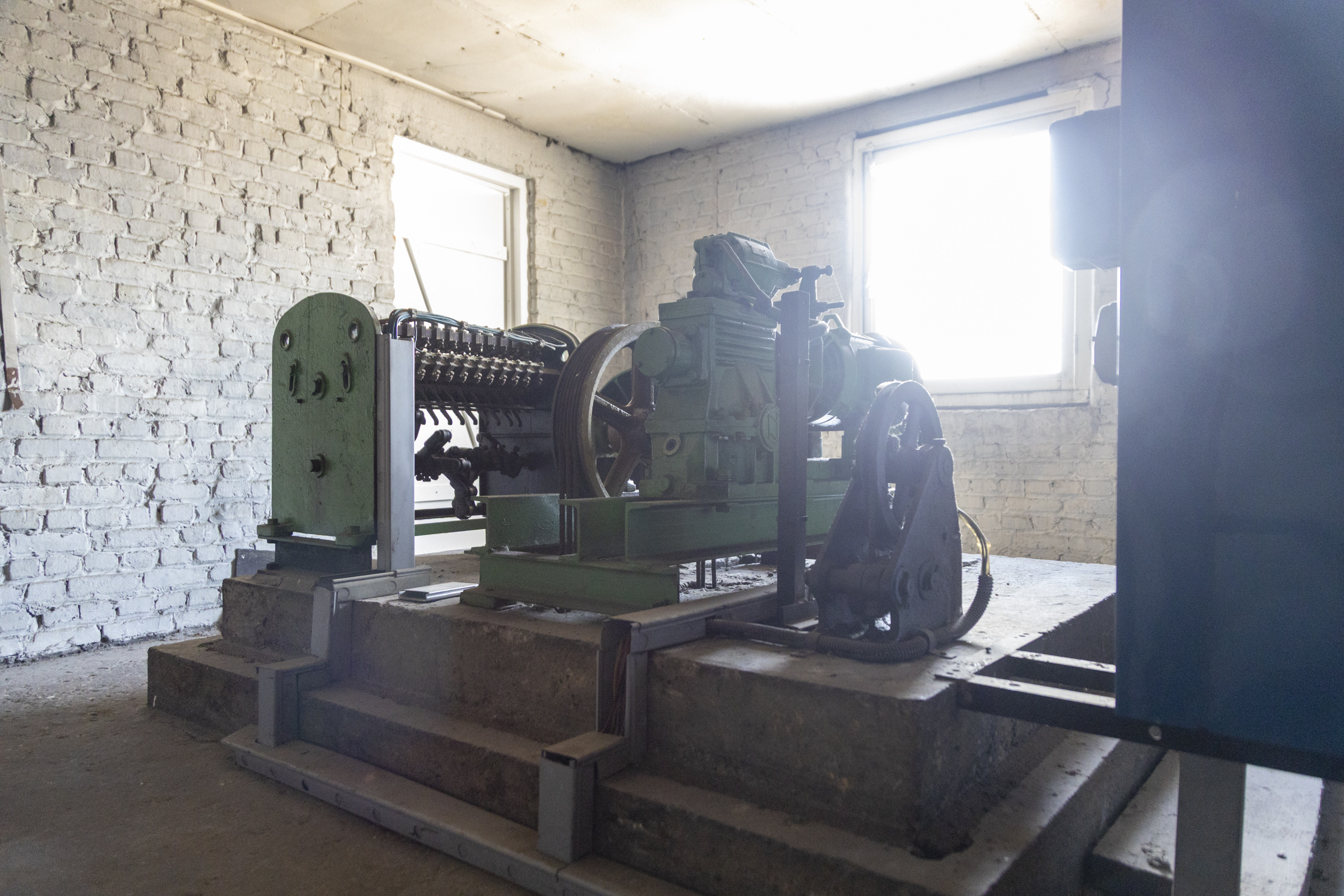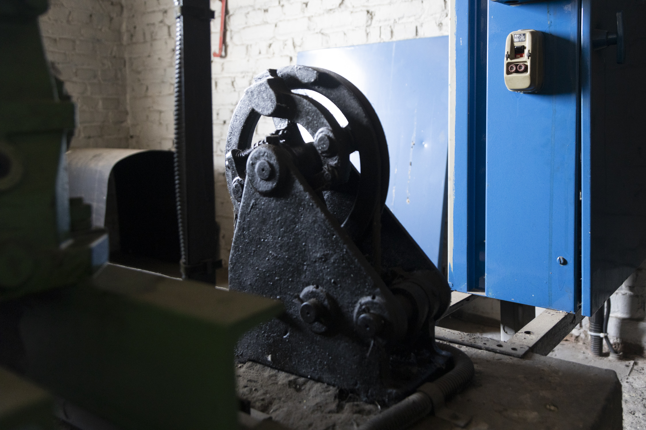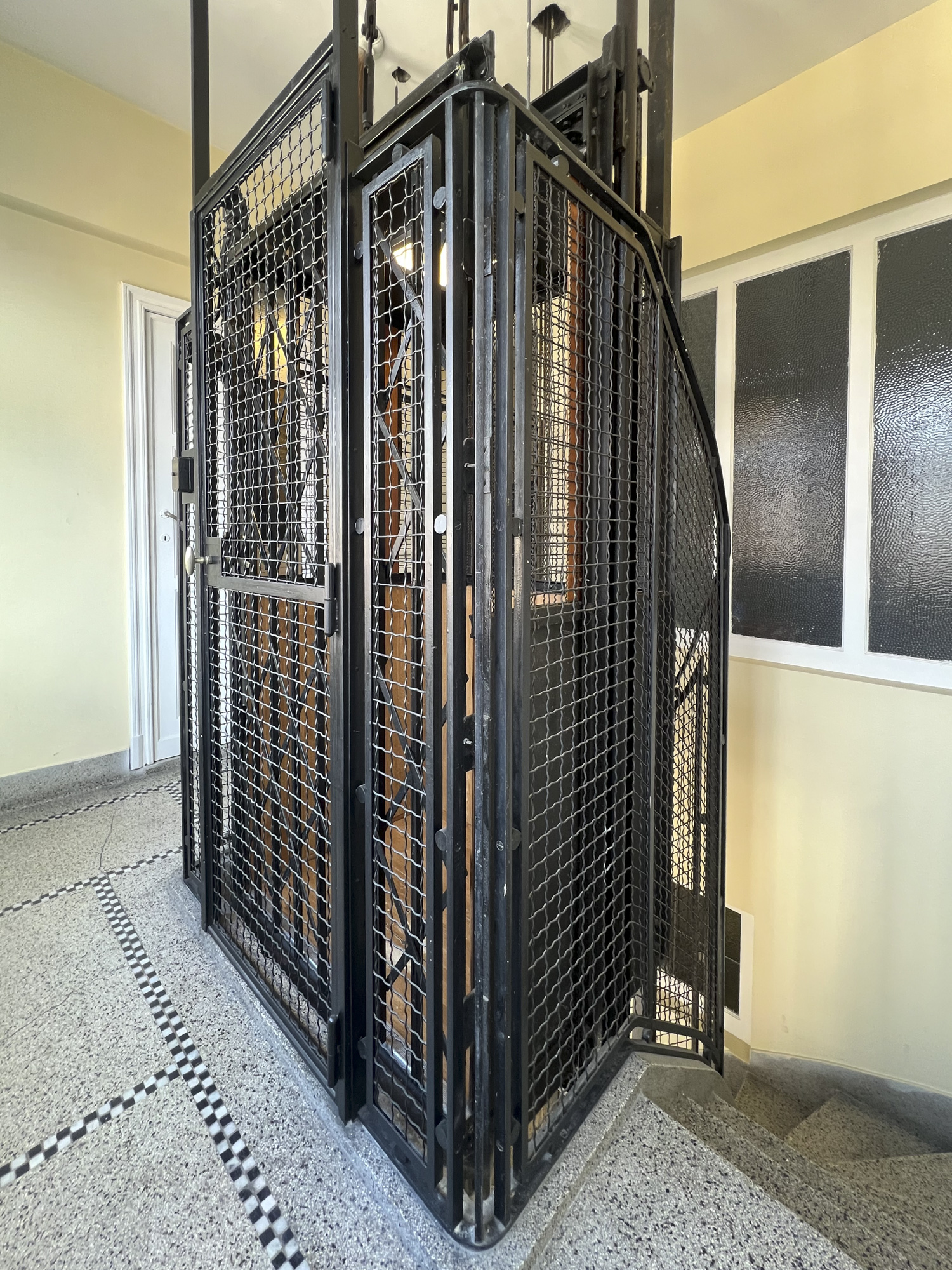 Plusieurs éléments techniques d’origine subsistent tels que les étriers de la cabine, ainsi que le système de freinDispositif placé sur l’axe du moteur qui le freine et le maintient à l’arrêt grâce à deux mâchoires se fermant sur un tambour. Par défaut, le frein est en position fermée. Son ouverture est déclenchée par l’intermédiaire d’une bobine ou d’un servomoteur. parachuteSystème de sécurité qui bloque la cabine sur ses guides en cas de rupture des câbles de traction ou de survitesse. sur l’étrier supérieur, et très probablement le contrepoidsRelié à la cabine par les câbles de traction et circulant le long de guides verticaux, il est généralement constitué d’éléments en fonte (gueuses). Son poids équivaut à celui de la cabine à demi-charge. Il contrebalance ainsi le poids de la cabine ce qui diminue l’énergie nécessaire à son déplacement.. La machinerieSitué dans un espace en partie basse ou en partie haute de l’installation, ensemble comprenant le système d’entraînement et les équipements de commande de l’ascenseur. a été remplacée partiellement, probablement en plusieurs phases. Des éléments anciens, peut-être d’origine, sont présents, comme le limiteur de vitesseDispositif pourvu d’une poulie sur laquelle passe un câble relié à la cabine. Grâce à un système basé sur la force centrifuge, il bloque le câble en cas de survitesse, ce qui déclenche le parachute. et le système de sélection d’étages. Le treuilAccouplé au moteur, dispositif mécanique qui entraîne les câbles de la cabine et du contrepoids sur un tambour ou une poulie d’adhérence. a été remplacé anciennement, il est actuellement équipé d’un moteurMoteur actionnant le treuil de l’ascenseur. italien et d’une poulieRoue dont la jante porte un ou plusieurs câbles afin de permettre la transmission d’un mouvement. Fixée sur l’axe du treuil, la poulie de traction (ou poulie d’adhérence) communique la force du moteur aux câbles de traction de la cabine et du contrepoids. La poulie de déflexion permet de déporter les câbles dans l’axe de la gaine de l’ascenseur et/ou du contrepoids. Les poulies de renvoi situées au-dessus de la gaine supportent les câbles de traction quand la machinerie est placée en bas. d’adhérence.