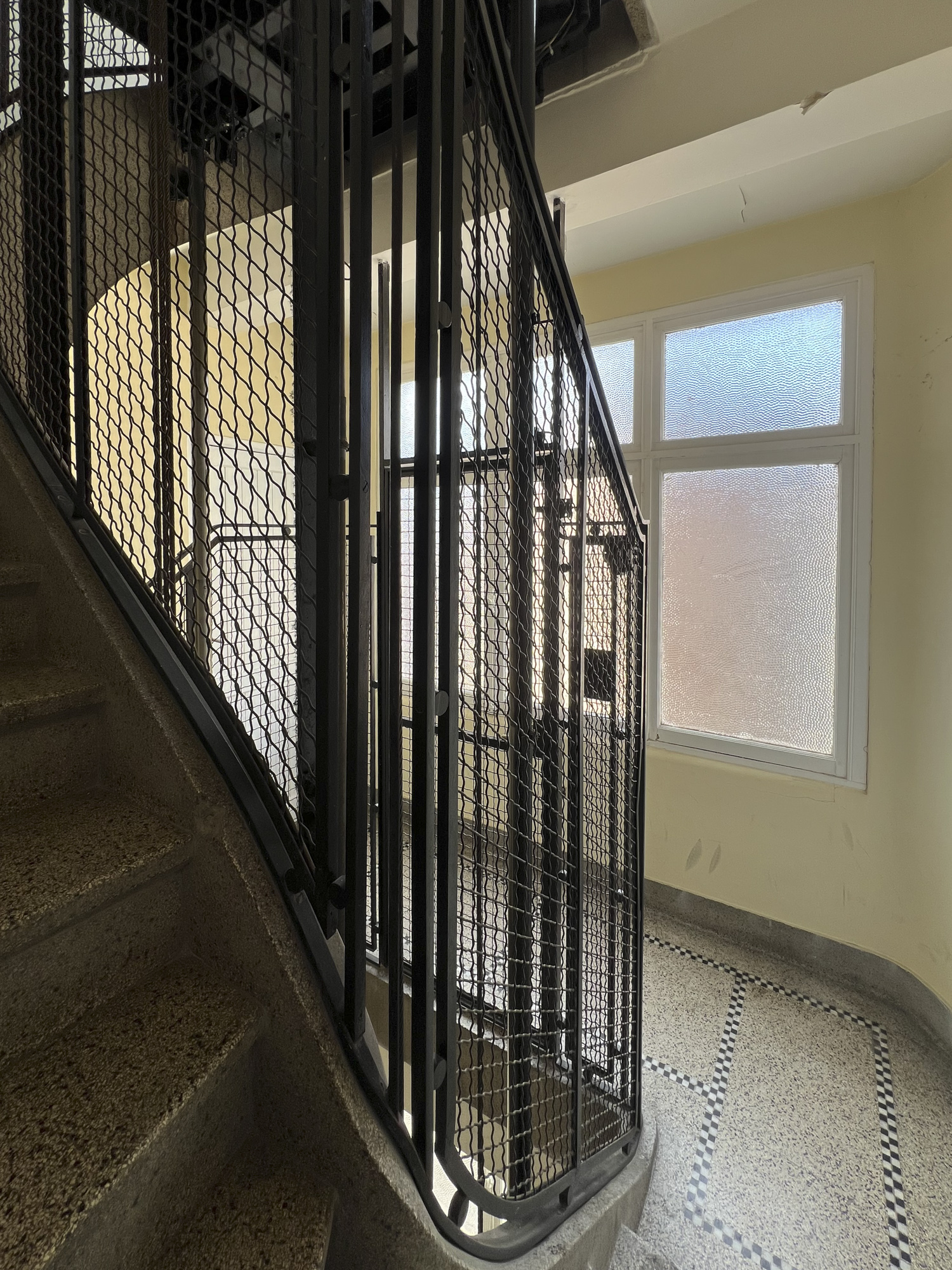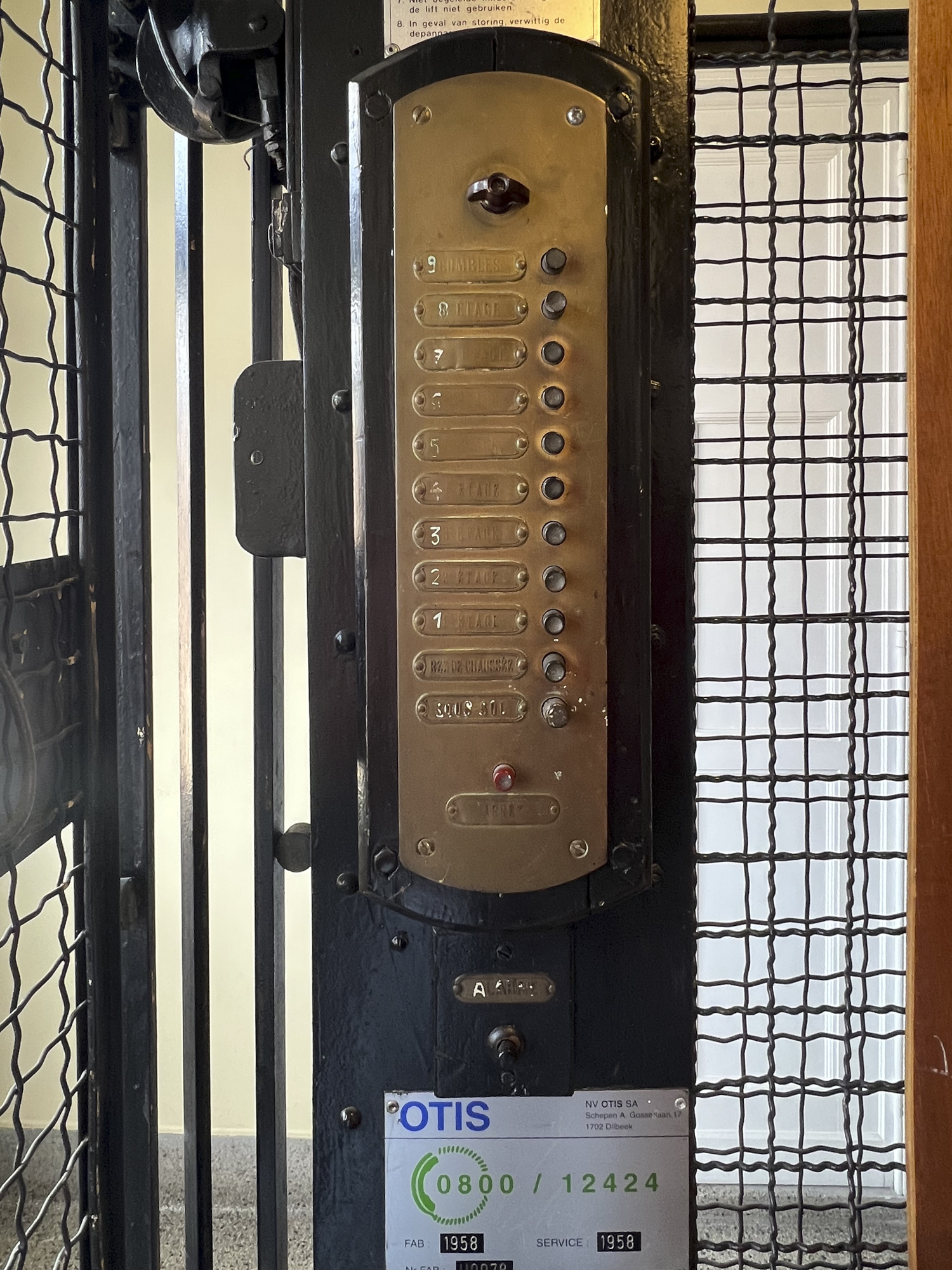 Immeuble à appartements, édifié d’après les plans des architectes parisiens L. Duhayon et M. Julien pour la «Société immobilière de Belgique», en 1925, 1926 et 1930. Il est équipé, dès l’origine, de deux ascenseurs, l’un destiné aux habitants, l’autre aux services. De marque Jaspar, l’ascenseur secondaire circule dans le jour1. Ouverture vitrée dans une menuiserie ou baie de petite dimension; 2. Vide autour duquel se développent certains escaliers tournants. de la cage d’escalier en granito dédié au personnel de service et dessert 11 niveaux. Il est positionné dos à l’ascenseur principal, aligné sur l’axe de celui-ci et de l’entrée principale. Il circule en gaineEspace dans lequel se déplacent la cabine et/ou le contrepoids, délimité par les parois, le plafond et le fond de la cuvette. La gaine peut être fermée ou partiellement ouverte. partiellement ouverte, dont la protection est formée d’une structure métallique fixée au limon de l’escalier, intégrant des panneaux de treillis fixés à l’aide de disques. Les angles sont traités à l’aide de barres verticales de section rectangulaire. Les portes palières, à simple ouvrant, sont composées d’une structure métallique enserrant un treillis. Les boutons d’appel d’origine sont conservés.