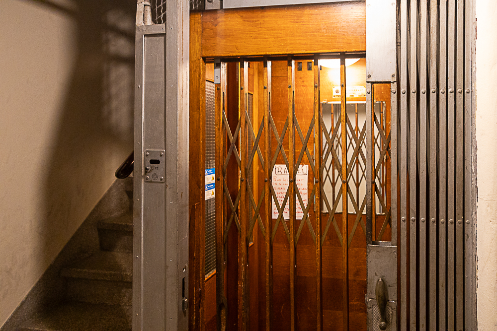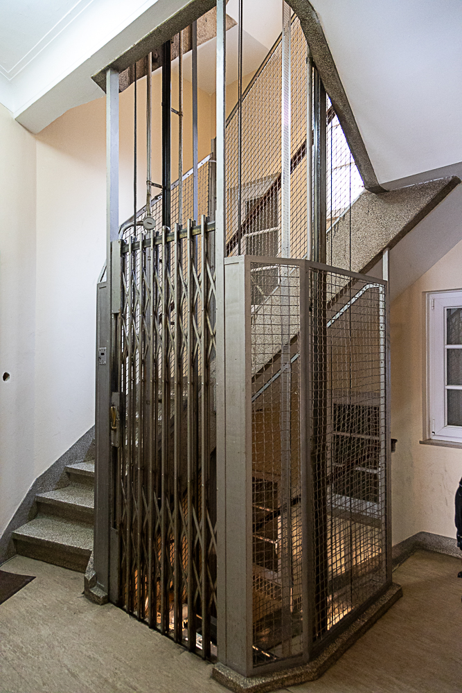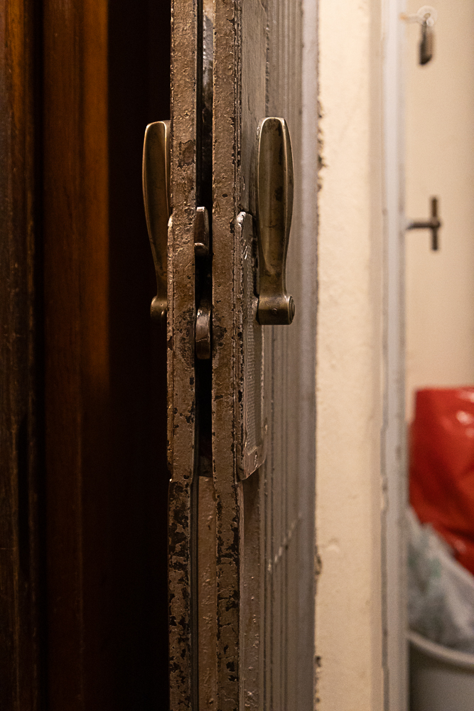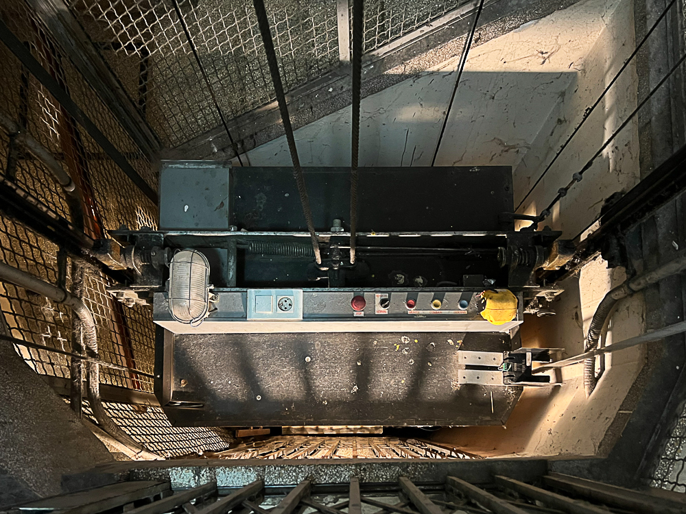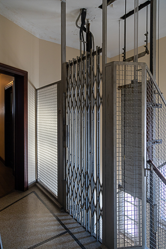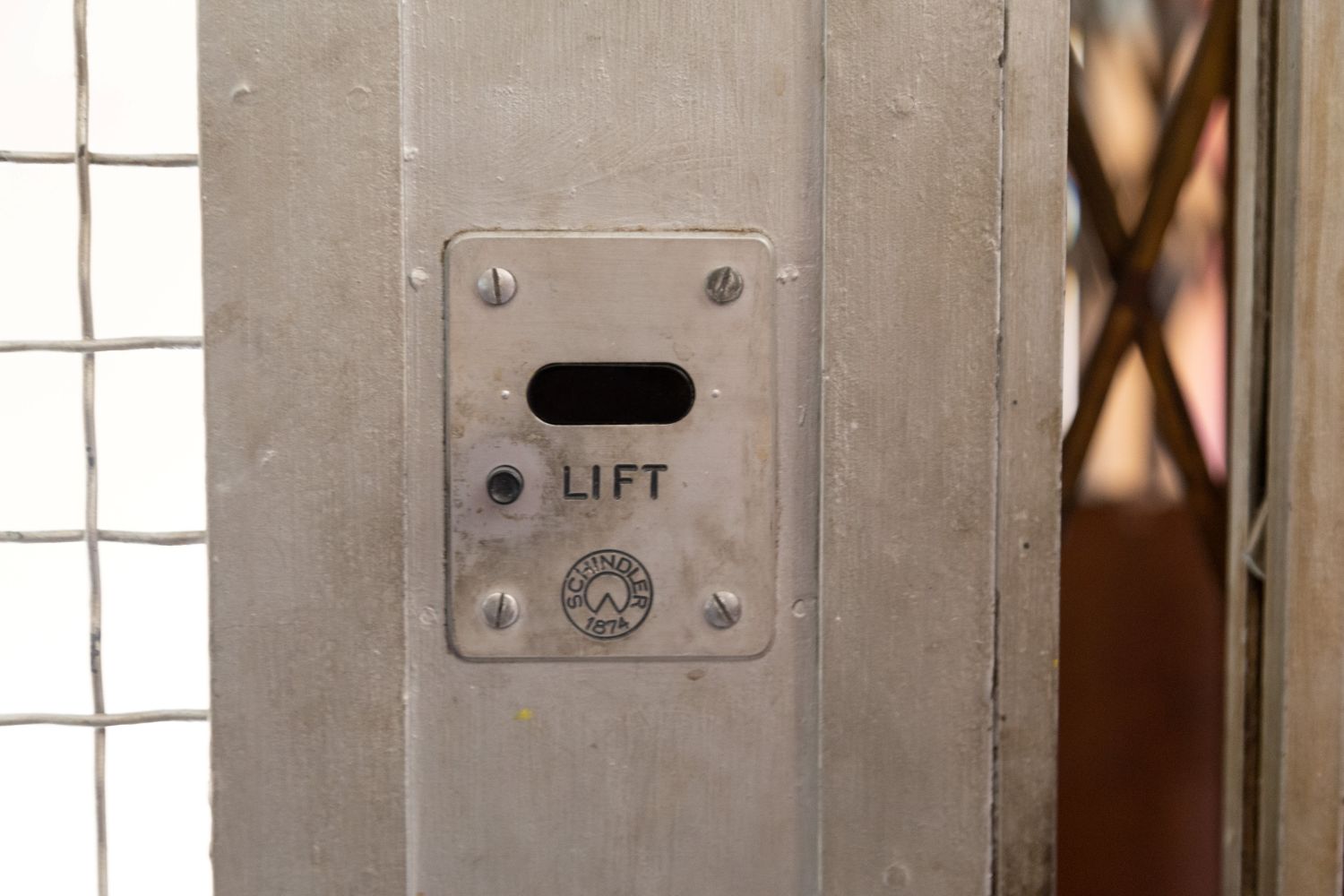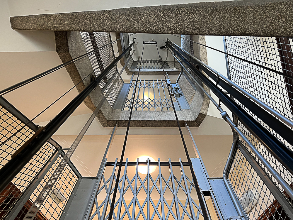 La protection de la gaineEspace dans lequel se déplacent la cabine et/ou le contrepoids, délimité par les parois, le plafond et le fond de la cuvette. La gaine peut être fermée ou partiellement ouverte. partiellement ouverte est formée de cadres métalliques enserrant un treillis, posés sur le limon de l’escalier et sur une plintheAssise inférieure d’un soubassement ou soubassement de hauteur particulièrement réduite. en granitoMatériau composé de mortier et de pierres colorées concassées présentant, après polissage, l’aspect d’un granit. au rez-de-chaussée et aux paliers. La face avant est formée de tôles métalliques et de portes palières à grilles rétractiles métalliques équipées de poignées d’un modèle peu courant, qui pivotent verticalement. Les boutons d’appel d’origine sont conservés.
