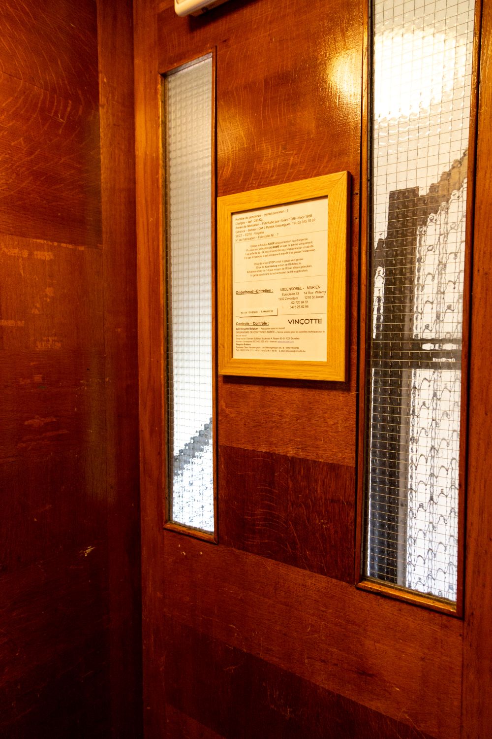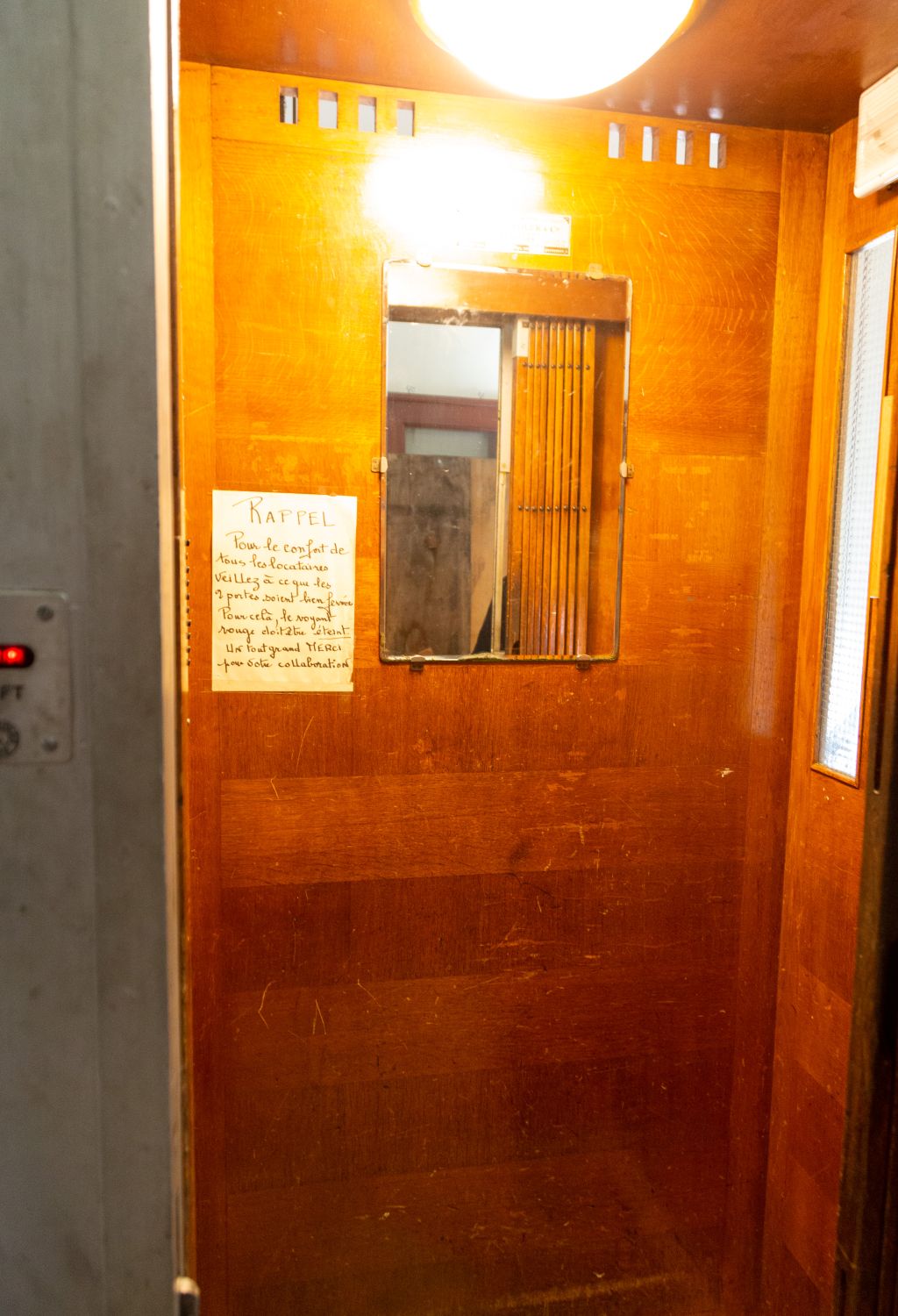 La cabine de forme polygonale est revêtue d’un placage de bois de chêne typique des équipements Schindler, à bandes de feuilles de bois posées tantôt verticalement, tantôt horizontalement. Elle est percée de quatre ouvertures oblongues munies de verres armés. Les équipements anciens, probablement d’origine, sont présents : orifices de ventilation en partie haute, boutons de commandeSérie de boutons placés en cabine qui permettent de sélectionner automatiquement l’étage souhaité. Un bouton d’arrêt, un bouton d’alarme et un interrupteur pour l’éclairage complètent souvent ce dispositif., miroir, plaques signalétiques, marque de fabriqueGraphisme destiné à identifier une firme. Il peut prendre la forme d’une plaquette, d’un lettrage en relief... et grille rétractileSystème de fermeture, constitué de montants réunis par des croisillons mobiles, qui se replie et se déplie sur lui-même entre un rail supérieur et un rail inférieur. en bois et en métal.