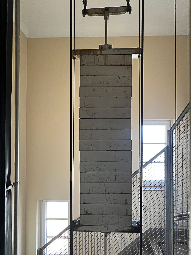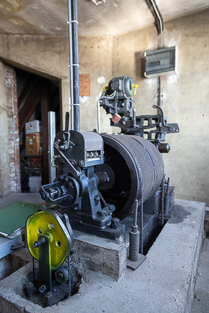 La machinerieSitué dans un espace en partie basse ou en partie haute de l’installation, ensemble comprenant le système d’entraînement et les équipements de commande de l’ascenseur., probablement d’origine, est conservée en grande partie : treuilAccouplé au moteur, dispositif mécanique qui entraîne les câbles de la cabine et du contrepoids sur un tambour ou une poulie d’adhérence. , moteurMoteur actionnant le treuil de l’ascenseur., freinDispositif placé sur l’axe du moteur qui le freine et le