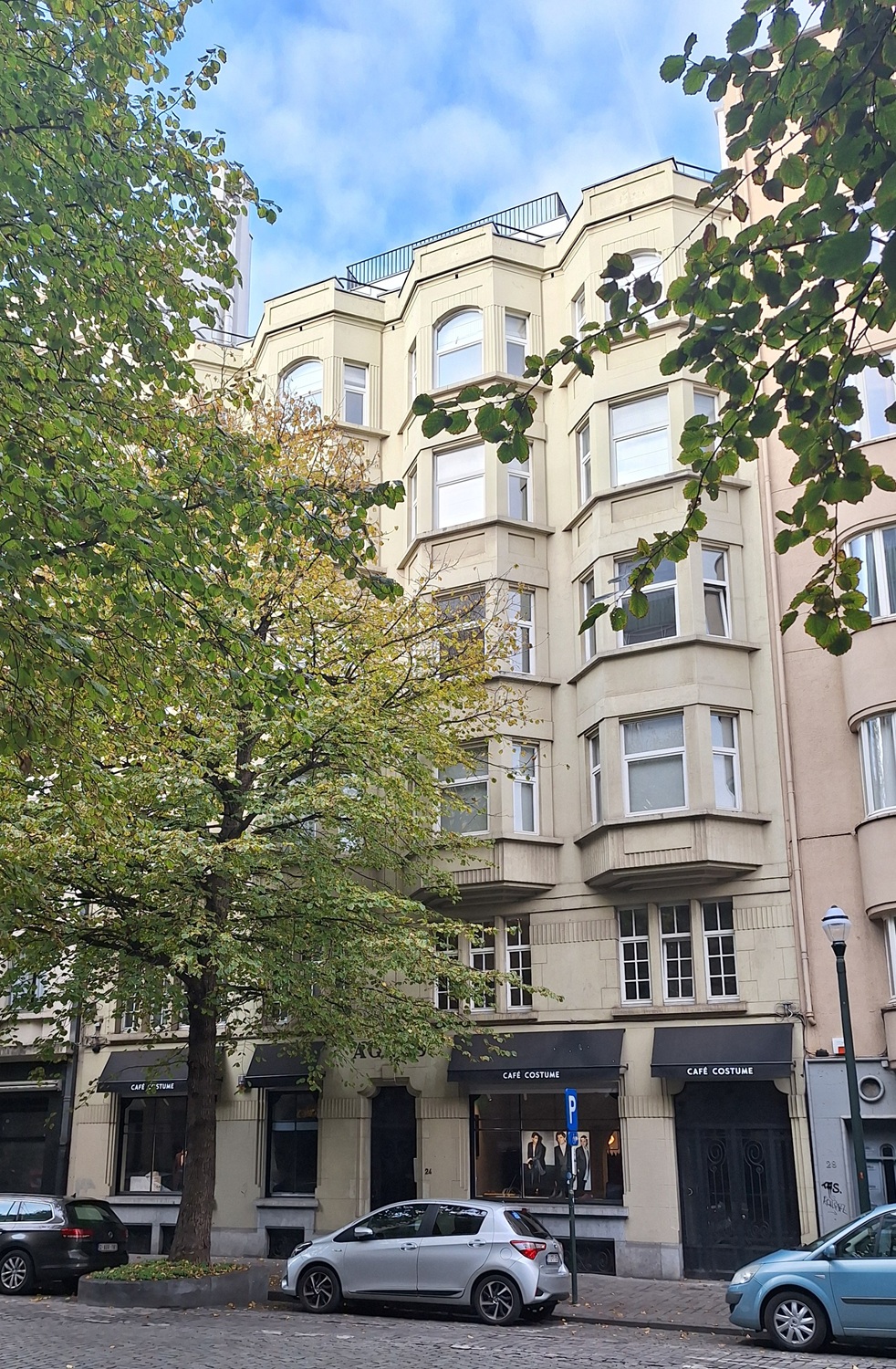 Immeuble à appartements de six niveaux de style Art DécoStyle Art Déco (entre-deux-guerres). Tendance à la géométrisation des formes et des ornements architecturaux, doublée de jeux de matériaux, de textures et de couleurs. selon permis de 1929, par les architectes A et H Vandaele, et prévoyant l'ascenseur.