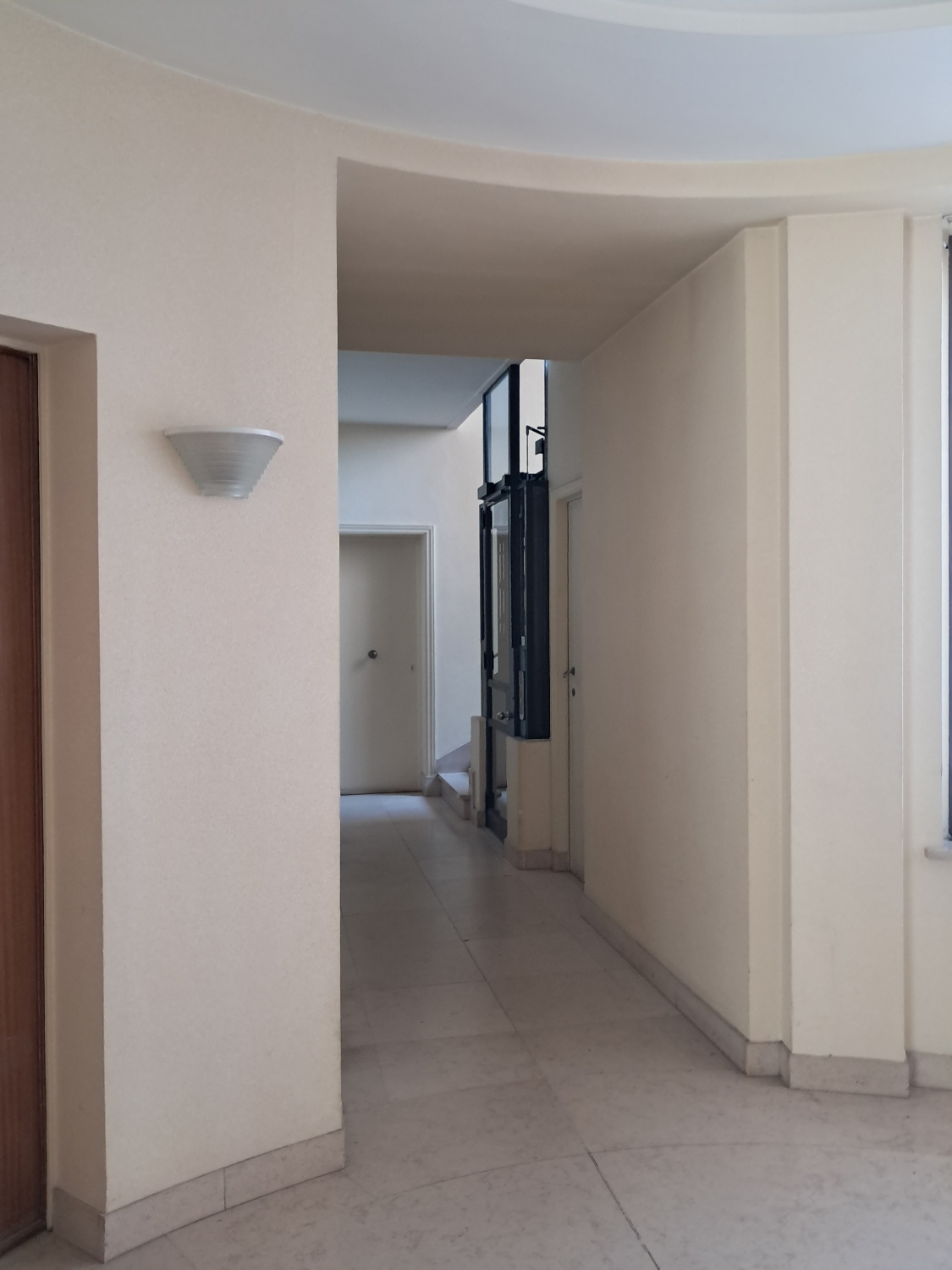 La Résidence Montgomery est un immeuble à appartements de haut standing construit selon des plans de 1947 des architectes Michel et Jean Polak qui signèrent en façade. Elle occupe, à l’angle de l’avenue de Tervueren et du square Montgomery, un emplacement de choix, jadis occupé par une villa de 1898. La façade, couverte d’un parementRevêtement de la face extérieure d’un mur. de pierre blanche affiche un modernismeLe modernisme (à partir des années 1920) est un courant international prônant la suprématie de la fonction sur la forme. Il se caractérise par l’emploi de volumes géométriques élémentaires, de la toiture plate, des fenêtres en bandeau et des matériaux modernes comme le béton armé. fonctionnel et sobre, typique des promotions immobilières d’après-guerre. La grande porte d’entrée vitrée en bronze ouvre sur un premier hall de plan triangulaire abritant les boîtes aux lettres. Ce vestibule donne lui-même accès par quelques marches à un deuxième hall également en marbre, s’élargissant en une rotonde éclairée par une grande baieOuverture, d'ordinaire une porte ou une fenêtre, ménagée dans un pan de mur, ainsi que son encadrement. à verre courbe. De cette rotonde, partent deux couloirs aboutissant chacun à une cage d’escalier. La partie habitation du complexe s’articule en effet en deux ailes, comprenant chacune deux appartements par étage. Chaque aile est desservie par sa propre cage d’escalier et par un ascenseur électrique de marque Schindler, installé en trémie ouverte, et datant, comme l’immeuble, de 1948.