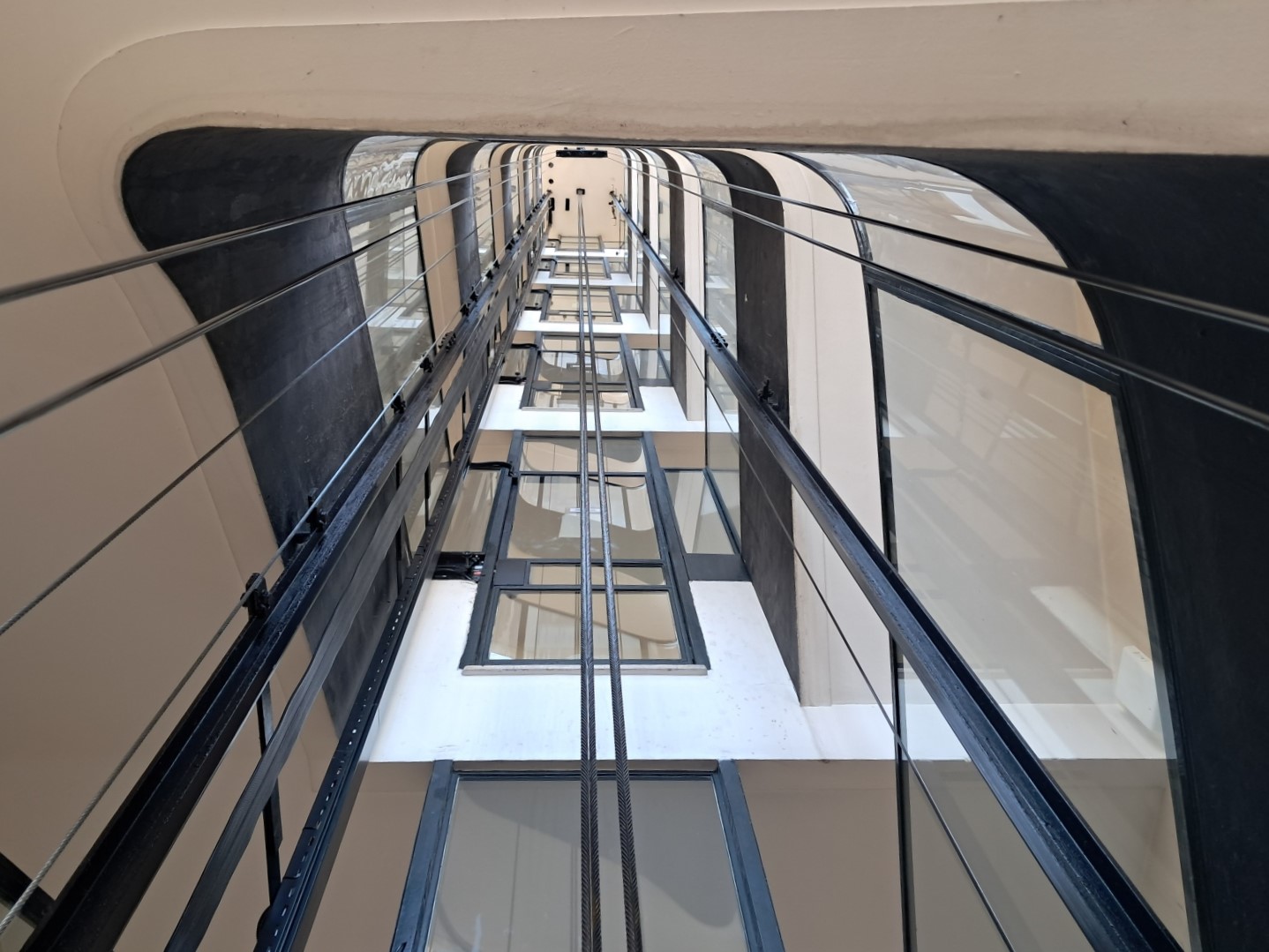 La machinerieSitué dans un espace en partie basse ou en partie haute de l’installation, ensemble comprenant le système d’entraînement et les équipements de commande de l’ascenseur., en toiture, a été entièrement renouvelée en 2022, avec moteurMoteur actionnant le treuil de l’ascenseur. gearless et armoire de commandePlacé dans la salle des machines, tableau électromécanique qui reçoit et transmet les informations nécessaires à la marche et à l’arrêt de l’ascenseur. électronique.