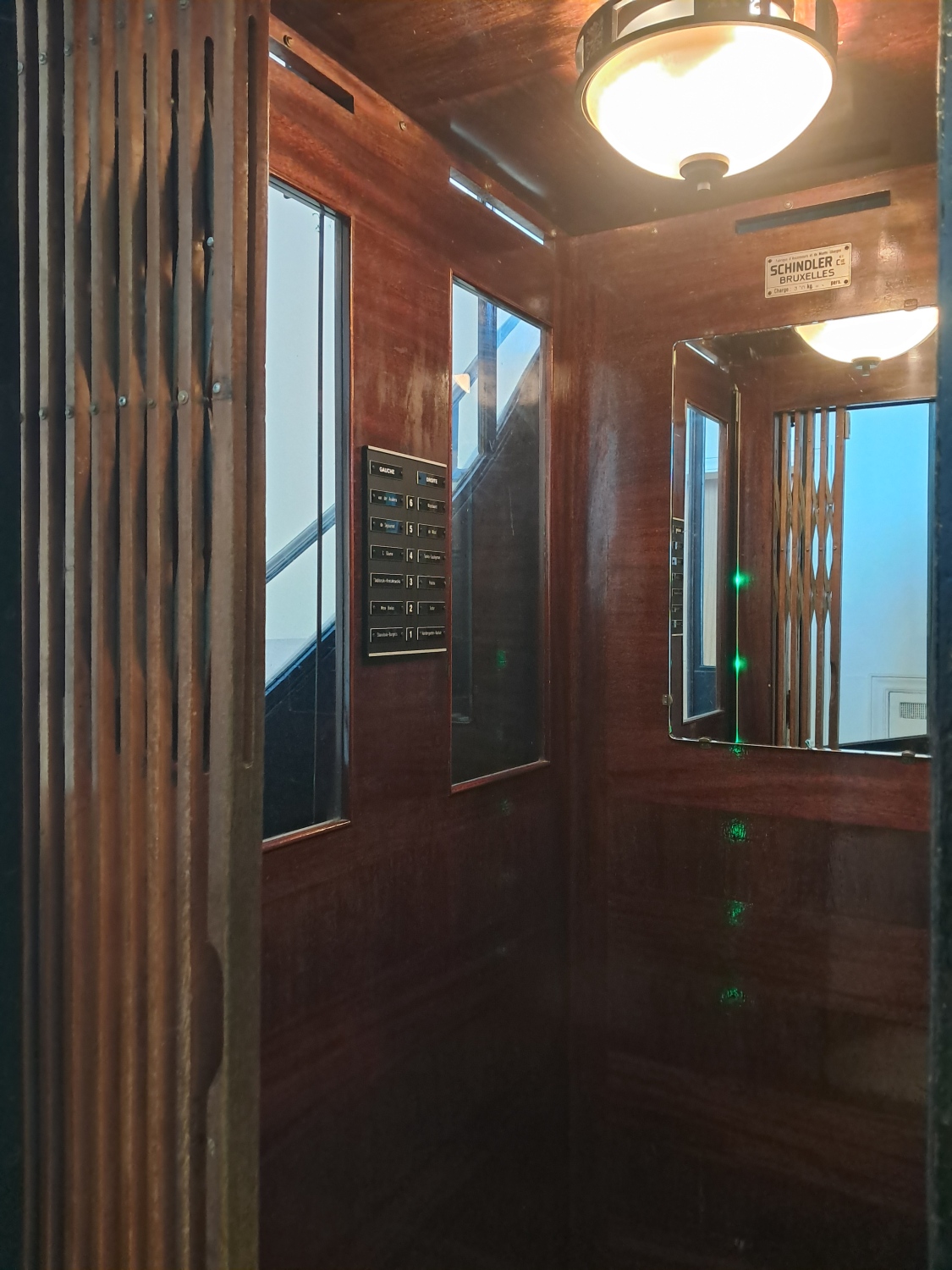 La vaste cabine en bois est typique de la production de Schindler de l’entre-deux-guerres, avec placage intérieur à bandes de feuille d'acajou (?). D’un design minimaliste et fonctionnel, elle est éclairée par des jours1. Ouverture vitrée dans une menuiserie ou baie de petite dimension; 2. Vide autour duquel se développent certains escaliers tournants. vitrés et fermée par sa grille rétractileSystème de fermeture, constitué de montants réunis par des croisillons mobiles, qui se replie et se déplie sur lui-même entre un rail supérieur et un rail inférieur. en bois et métal d'origine. La bouton à boutons de commandeSérie de boutons placés en cabine qui permettent de sélectionner automatiquement l’étage souhaité. Un bouton d’arrêt, un bouton d’alarme et un interrupteur pour l’éclairage complètent souvent ce dispositif. Schindler d'origine a été remplacée par un dispositif de type moderne en 2022.