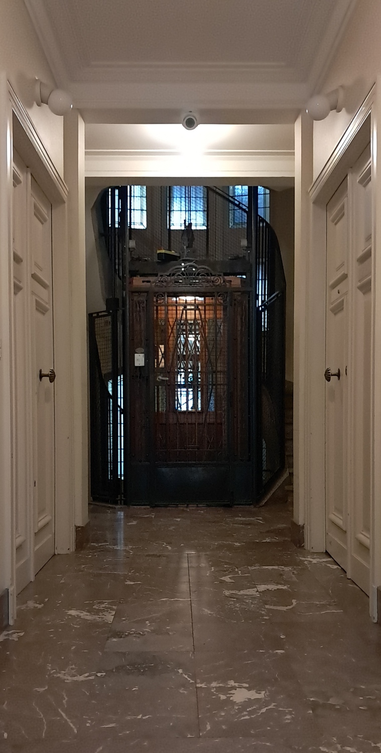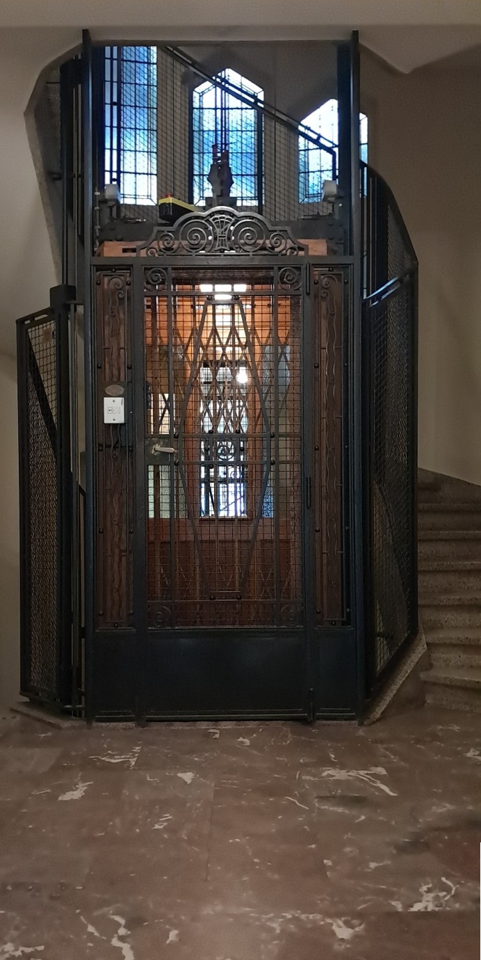 interbellum, beschikt dit gebouw over zowel een hoofdliftIn het nederlands gebruiken we de term hoofdlift wanneer er in het gebouw ook een dienstlift aanwezig is. als een dienstliftSecundaire lift voor gebruik door huispersoneel en vervoer van voorraden. .