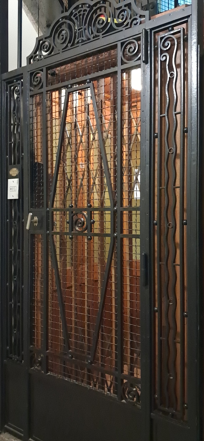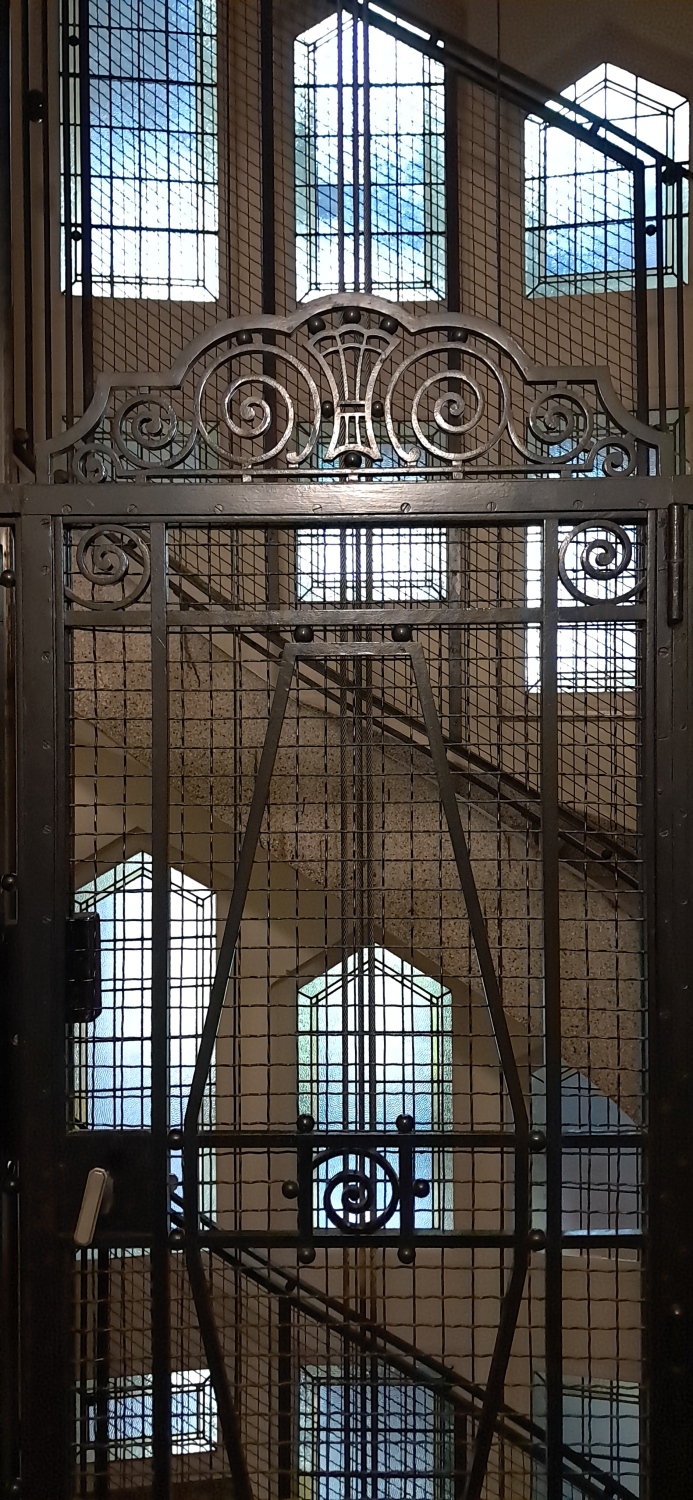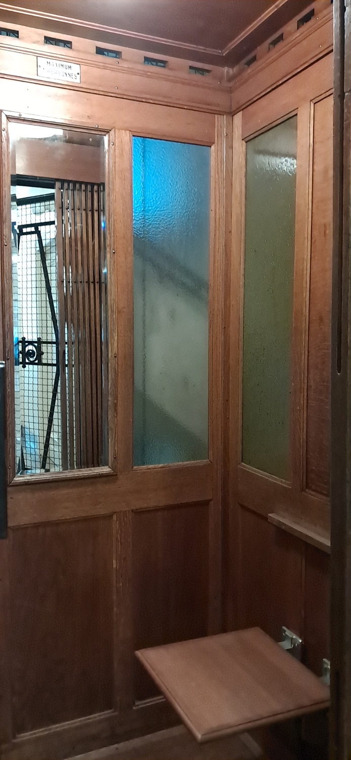 De hoofdliftIn het nederlands gebruiken we de term hoofdlift wanneer er in het gebouw ook een dienstlift aanwezig is. is ondergebracht in een veelhoekig trappenhuis en wordt afgeschermd door een getraliede borstwering1. Verhoogd gedeelte van een vestingsmuur waarachter men veilig kan lopen; - 2. Muurtje of hekwerk (balkon, terras); - 3. Deel van een muur tussen vloer en onderzijde van een venster; - 4. Verhoging van de buitenmuren van een huis boven de zolderbalken waarop een muurplaat rust.. De houten cabine is grotendeels verlicht door ramen met geel structuurglas en uitgerust met een spiegel. Ze wordt afgesloten met een houten vouwhekEen sluitsysteem bestaande uit door beweegbare dwarsbalkjes verbonden met staanders, en dat tussen een boven- en een onderrail in- en uitklapt..