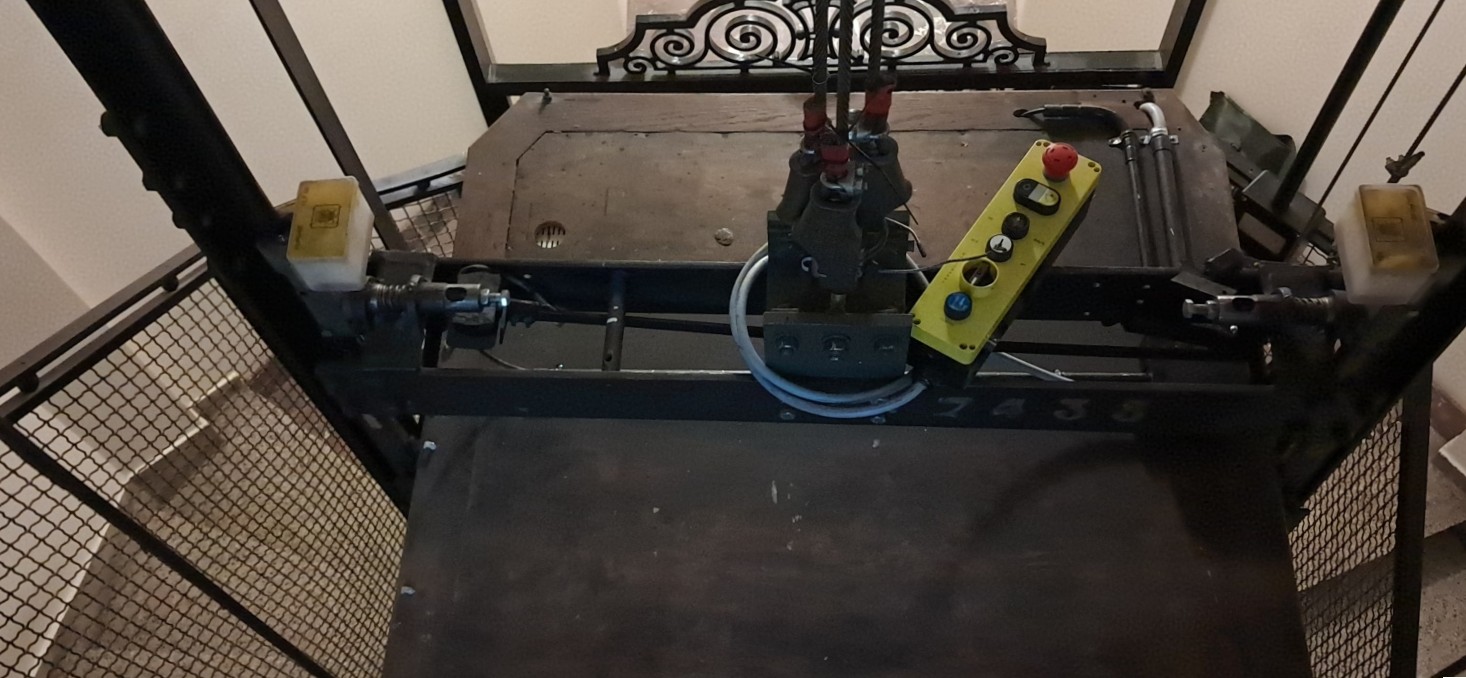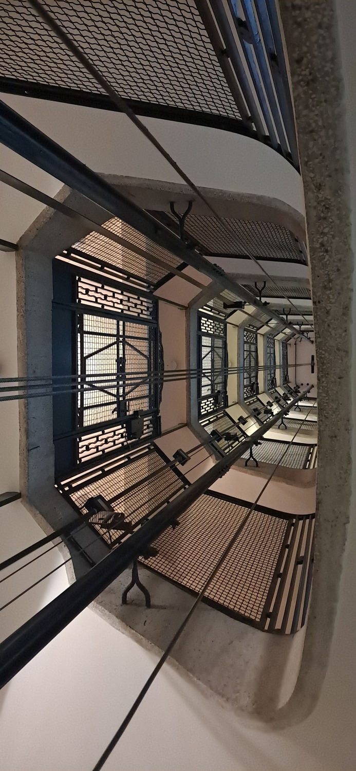 De machinerieIn een ruimte onderaan of bovenaan de installatie, een samenstel van aandrijf- en besturingsapparatuur van de lift. bevindt zich op de zevende verdieping, ter hoogte van de voormalige kamers voor het dienstpersoneel.