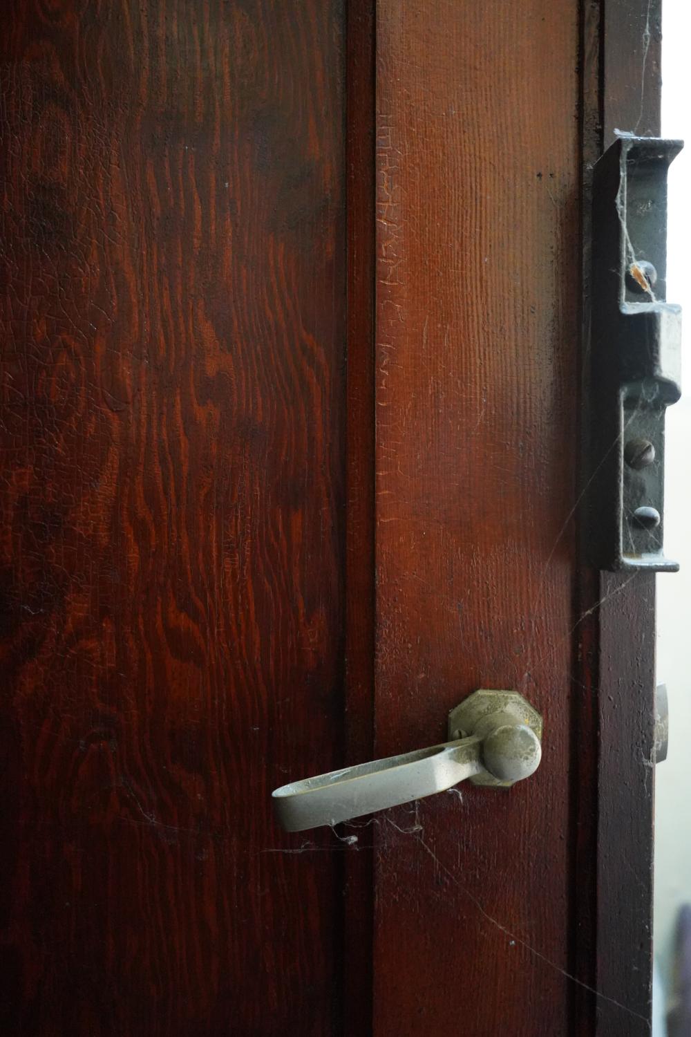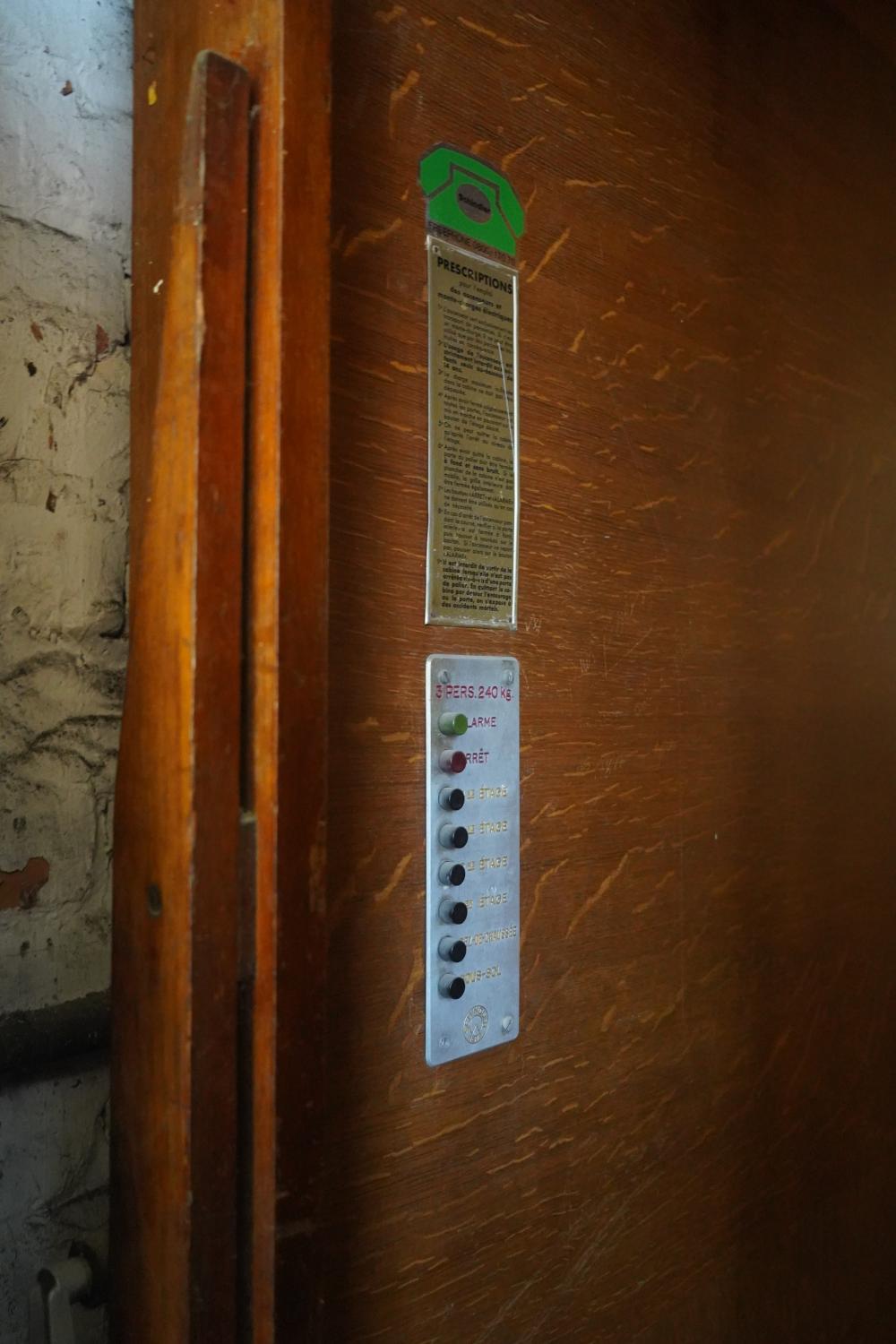 In de liftkooi zijn de oorspronkelijke voorzieningen nog aanwezig: metalen vouwhekEen sluitsysteem bestaande uit door beweegbare dwarsbalkjes verbonden met staanders, en dat tussen een boven- en een onderrail in- en uitklapt., bedieningspaneel, spiegel, identificatieplaatjes en fabrieksmerkEen grafisch ontwerp bedoeld om een bedrijf te identificeren. Het kan de vorm aannemen van een plaat, verhoogde letters, enz..