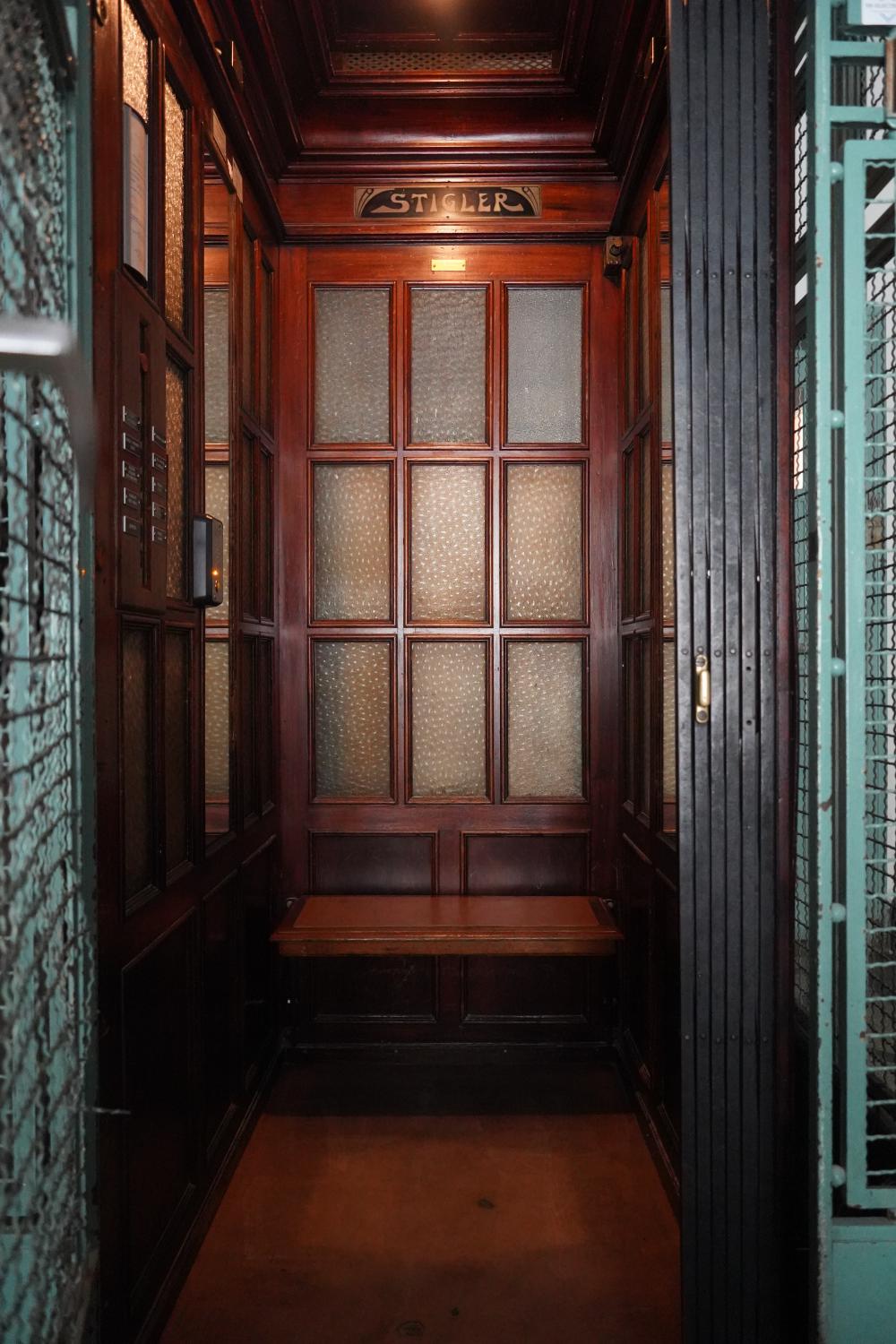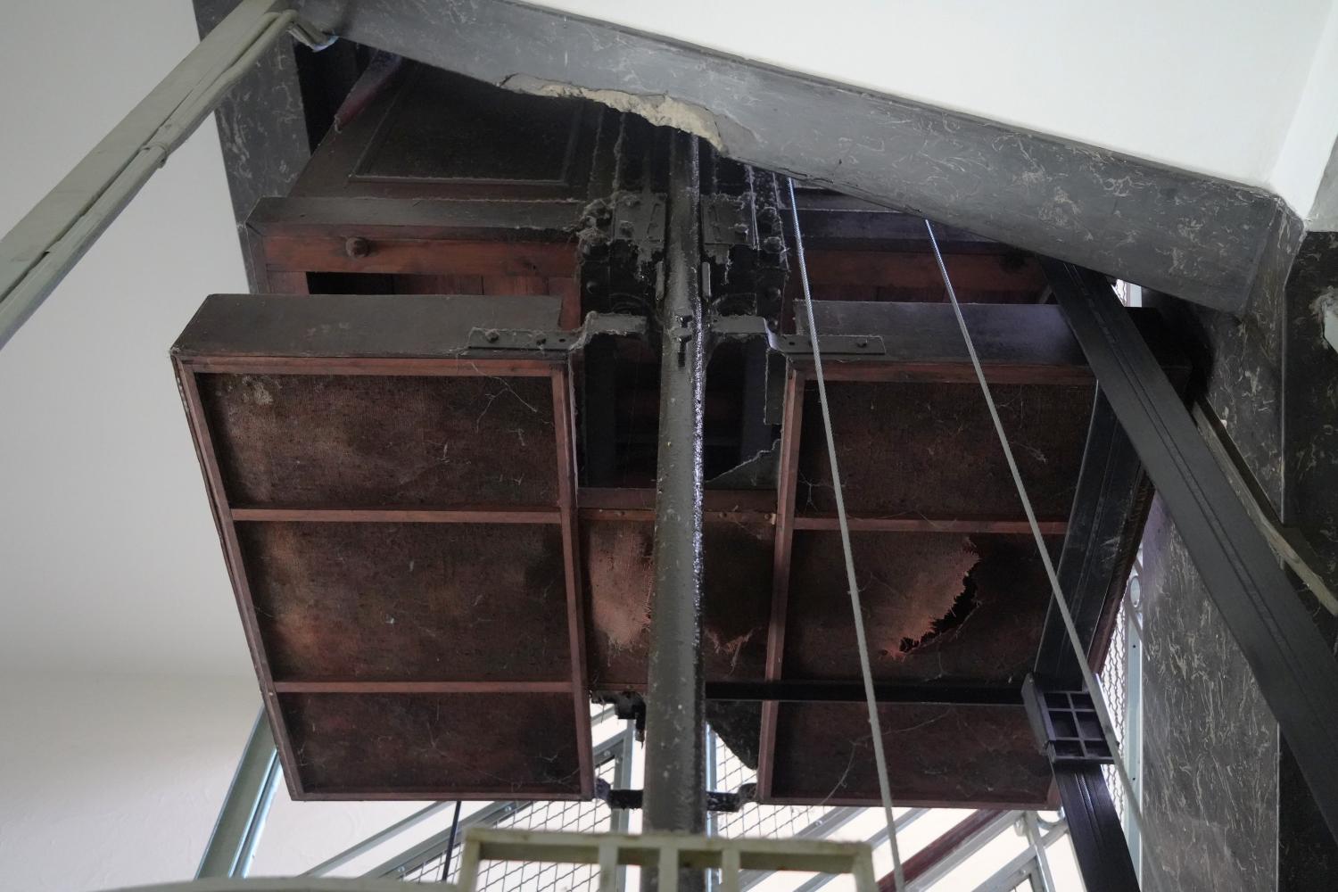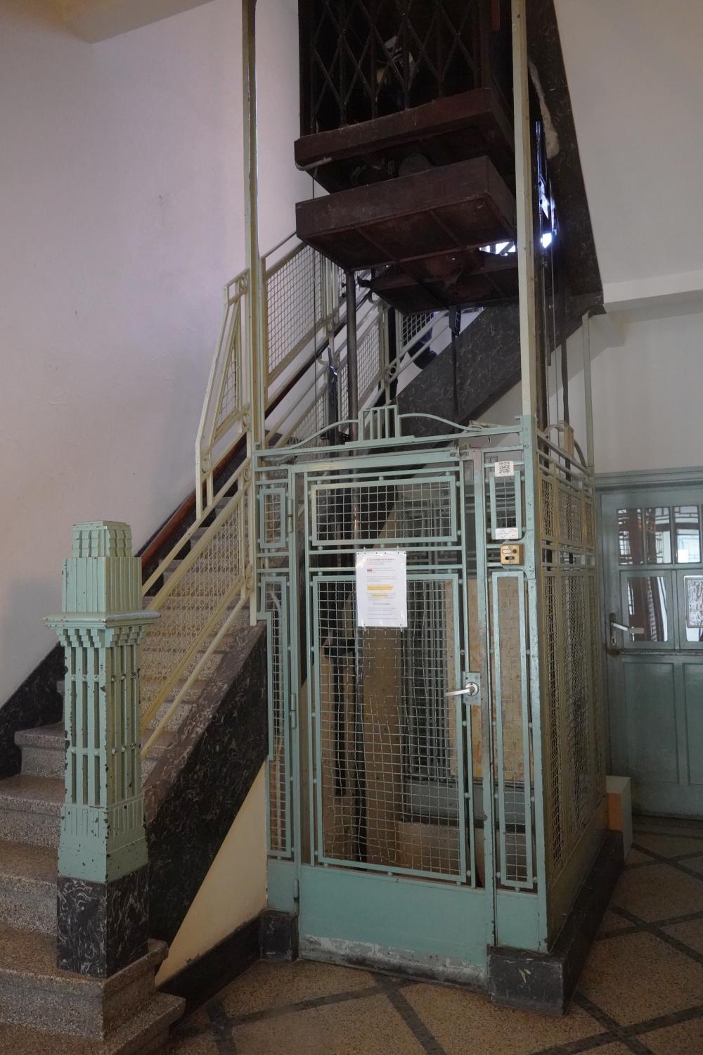 De houten liftkooi (mahonie) met zorgvuldig houtwerk is typerend voor de Stiglerkooien uit die tijd. De liftkooi is mooi opengewerkt met kleine ruiten met figuurglas en een verhoogd dak met opengewerkte metalen ventilatieroosters tussen het plafond en een imposante geprofileerde houten kroonlijstStelselmatig uitkragende geprofileerde lijst boven een muur of een ander belangrijk bouwdeel (entablement).. De liftkooi heeft een aantal van haar originele elementen bewaard: metalen vouwhekEen sluitsysteem bestaande uit door beweegbare dwarsbalkjes verbonden met staanders, en dat tussen een boven- en een onderrail in- en uitklapt., fabrieksmerkEen grafisch ontwerp bedoeld om een bedrijf te identificeren. Het kan de vorm aannemen van een plaat, verhoogde letters, enz., verlichting en schakelaarsdoosjes van de vanginrichting. Onder de liftkooi bevindt zich nog een bagageruimte die als goederenliftEen lift die voornamelijk bestemd is voor het vervoer van goederen/voorwerpen. kan worden gebruikt, bijvoorbeeld om kolenemmers van de kelder naar de appartementen te brengen. Deze installatie is vrij zeldzaam geworden en is momenteel niet meer in gebruik. Oorspronkelijk was het mogelijk de lift op de halve verdieping te stoppen om toegang te krijgen tot deze ruimte. Onder dit compartiment is de onderkant van de liftkooi voorzien van een houten bewegende frame, een typisch Stiglerkenmerk voor het gebruik van de vanginrichtingEen veiligheidssysteem dat de liftkooi op zijn geleiders vastzet in geval van een breuk in de tractiekabel of een te hoge snelheid. geval van eventueel contact.