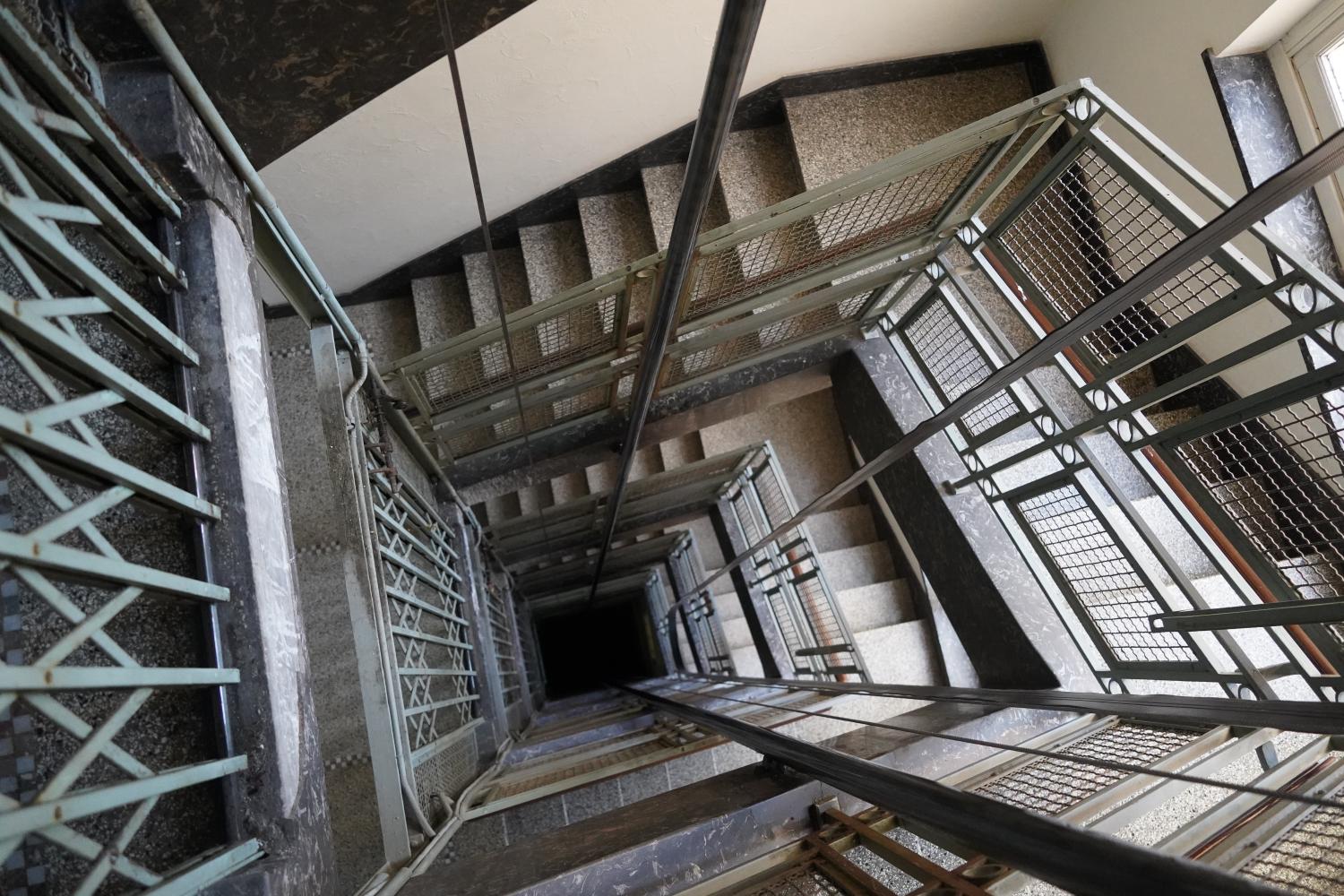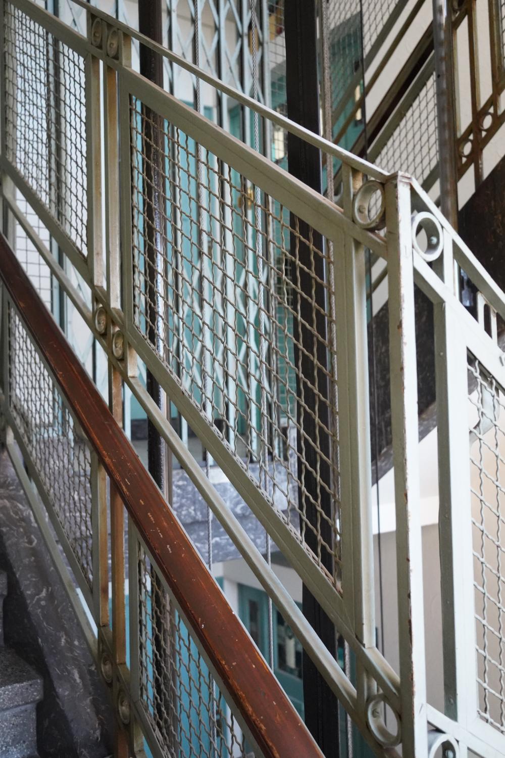 Een met marmer betegelde vestibule geeft toegang tot een hal met een granitovloer en mozaïeken boord dat een tegelpatroon vormt. (cfr. ID230). De Stiglerlift in het midden van de hal is geïnstalleerd in een open schachtingang in een granito trappenhuisGedeelte van een gebouw waarin de trappen zijn ondergebracht.. (cfr. ID230). De draaiende bordesdeurDe deur op elk bordes die toegang geeft tot de liftkooi. op de benedenverdieping bestaat uit een frame van rechthoekige metalen staven die een vierkant gemaasd metaalgaas omsluiten verbonden door metalen bollen. De deuromlijsting wordt bekroond door een verfijnde smeedijzeren compositie waarvan de verticale elementen herinneren aan het smeedijzeren uiteinde van de trapleuning. Op de verdiepingen zijn de bordesdeuren voorzien van vouwhekken. Het ijzerwerk van de trapleuningen wordt gevormd door dubbel paneelwerk uit rechthoekige metalen staven die een met ruitvormige mazen traliewerk omsluiten. (cfr. ID230). Deze panelen zijn zelf omlijst door dezelfde metalen staven en cirkels op elke hoek.